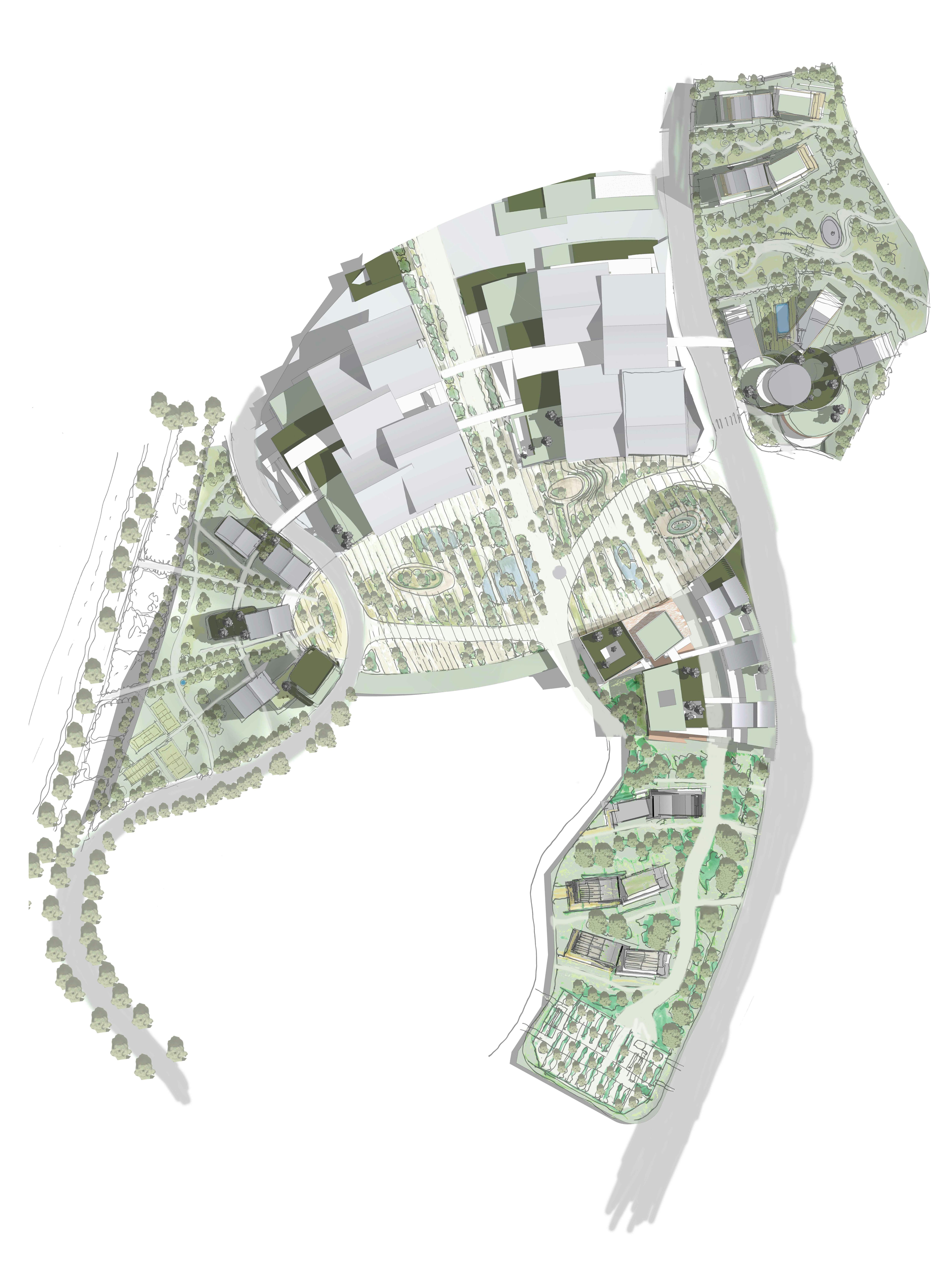 Le projet s’organisent dans un parc autour d’une place ovale, posée dans le paysage. Les bâtiments se glissent dans le terrain par de grands toits végetalisés, d’autres recouverts de tuiles métalliques flottent au dessus et se signalent dans le grand paysage.