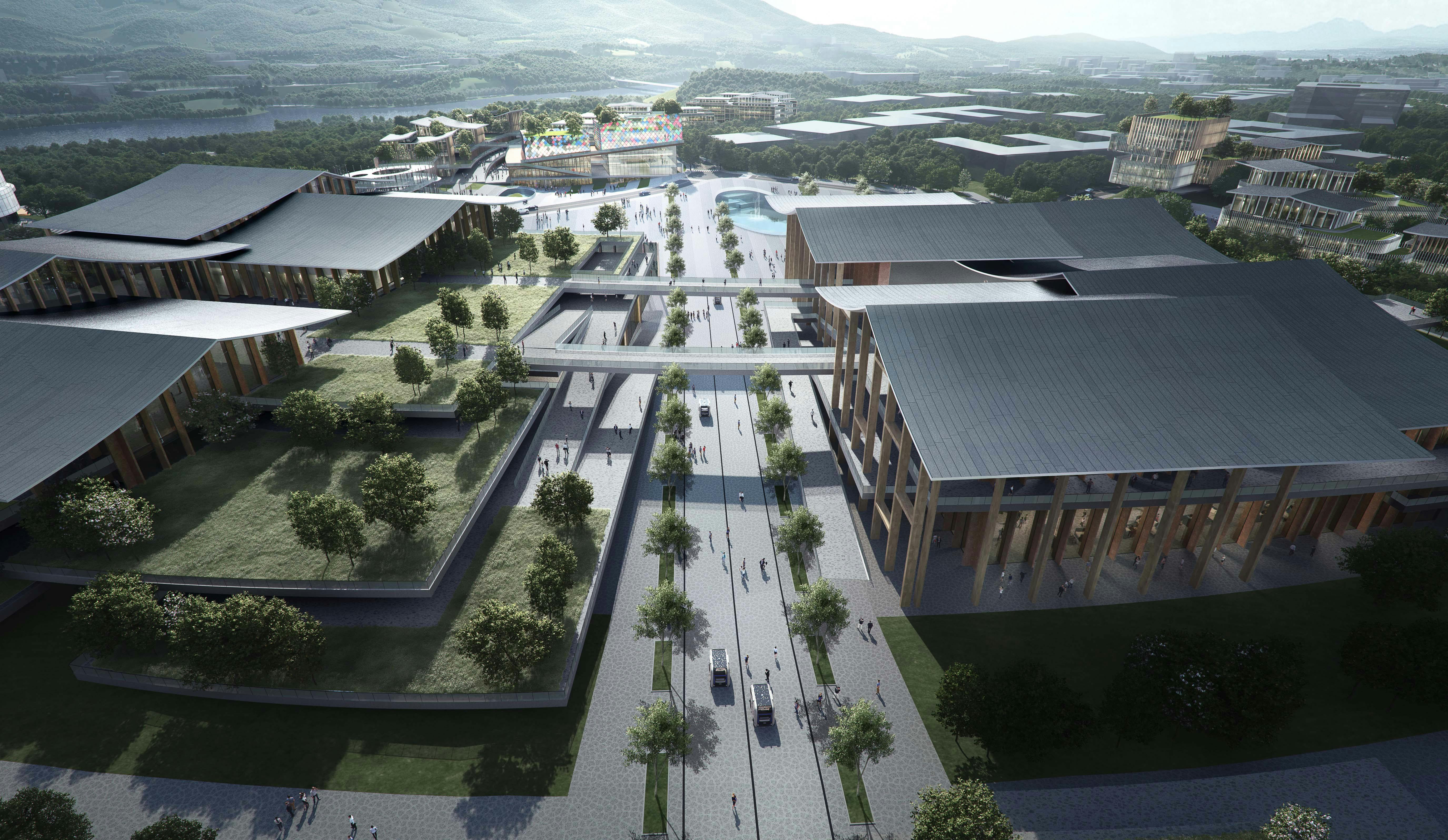 Les volumes ont des formes souples élégantes adaptées aux flux de circulation rapides et naturelles. Une architecture qui fait la part belle à la nature en la respectant, des structures légères de bois et de métal reprenant les fondamentaux de l’architecture chinoise. Le nouveau parc urbain allie architecture écologique d’avant-garde et traditions. Il est la symbiose entre paysage et humanité.