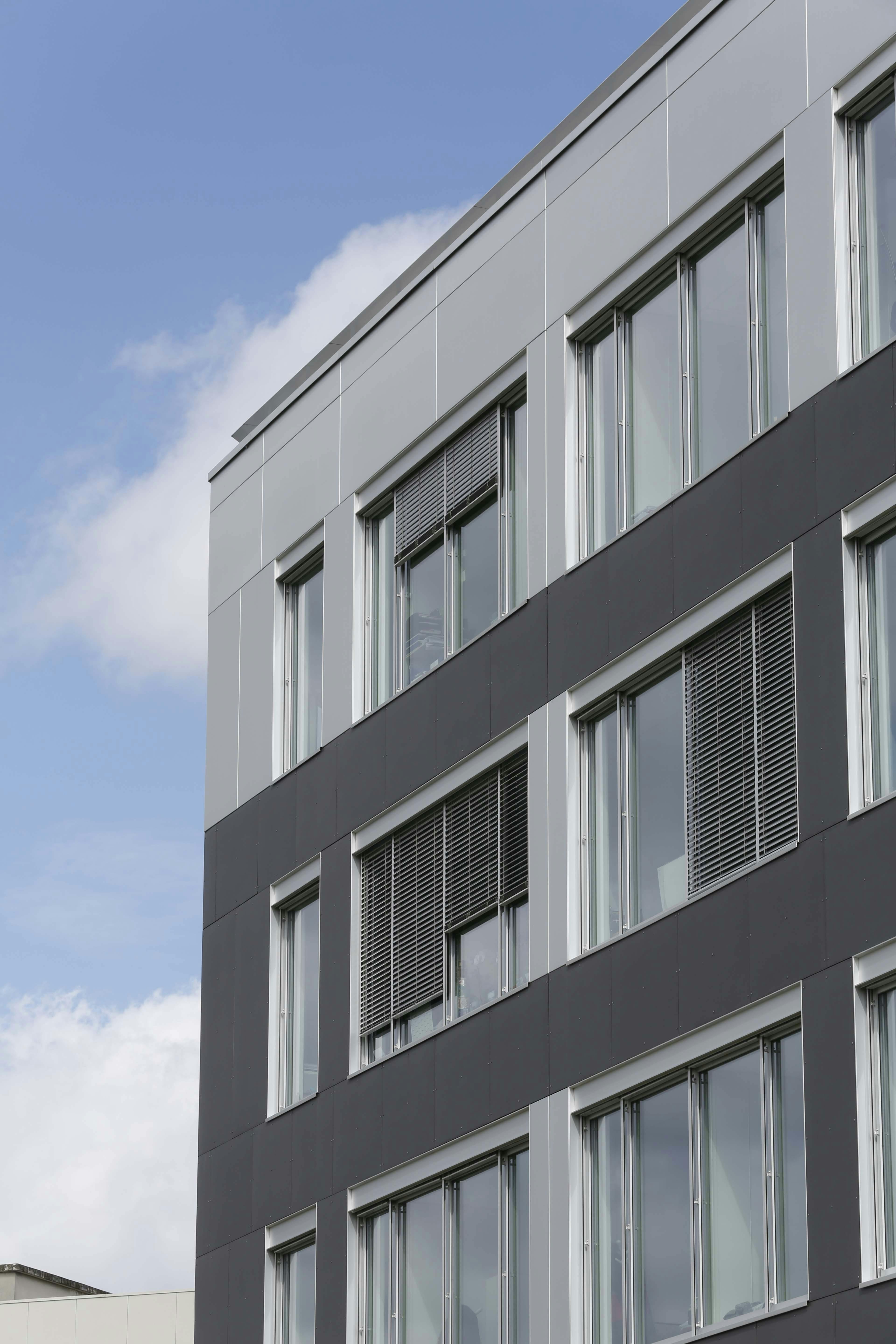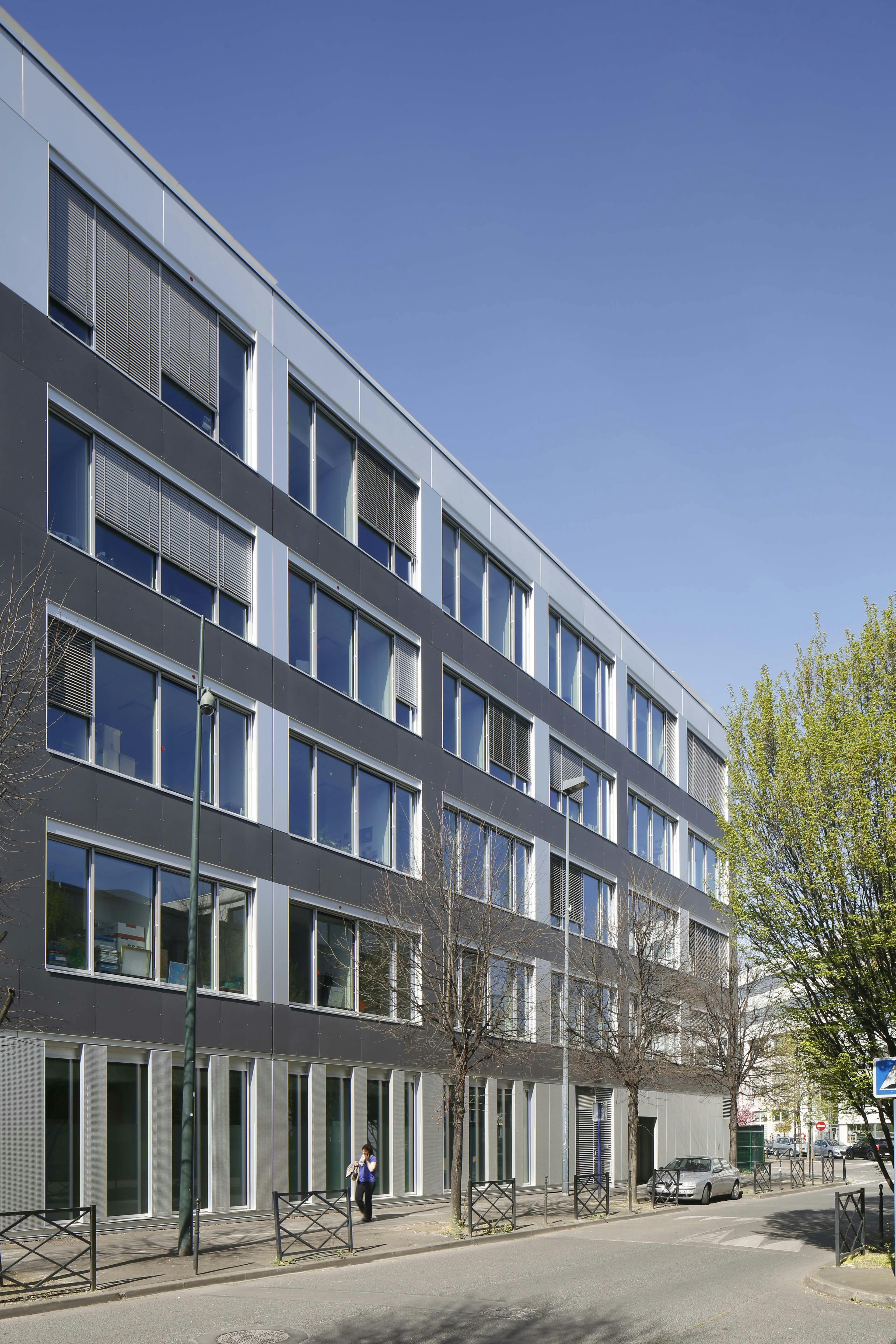 La composition des façades est très classique avec un soubassement, un étage courant, et un attique. Le revêtement minéral gris foncé du soubassement ainsi que les différents retraits à rez-de-chaussée ont pour but d’alléger le bâtiment et d’éviter tout effet de masse. Le revêtement minéral gris clair de l’étage courant reprend la teinte de l’immeuble voisin (ou en sera assez proche). Le retrait à rez-de-chaussée au niveau de l’entrée ainsi que la faille en verre sérigraphié qui la surplombe, créent un appel depuis la rue, afin d’indiquer l’accès principal du bâtiment. De nombreuses horizontales créées à partir de brise-soleils, de lisses et de joints creux confère à l’étage courant un certain dynamisme et une certaine élégance. Ce principe d’horizontales est décliné sur l’ensemble du bâtiment afin d’obtenir un effet d’unité. Des installations techniques sont prévues en terrasse. Elles seront couvertes par une toiture en métal prélaqué gris et masquées par des ventelles métalliques prélaquées grises.