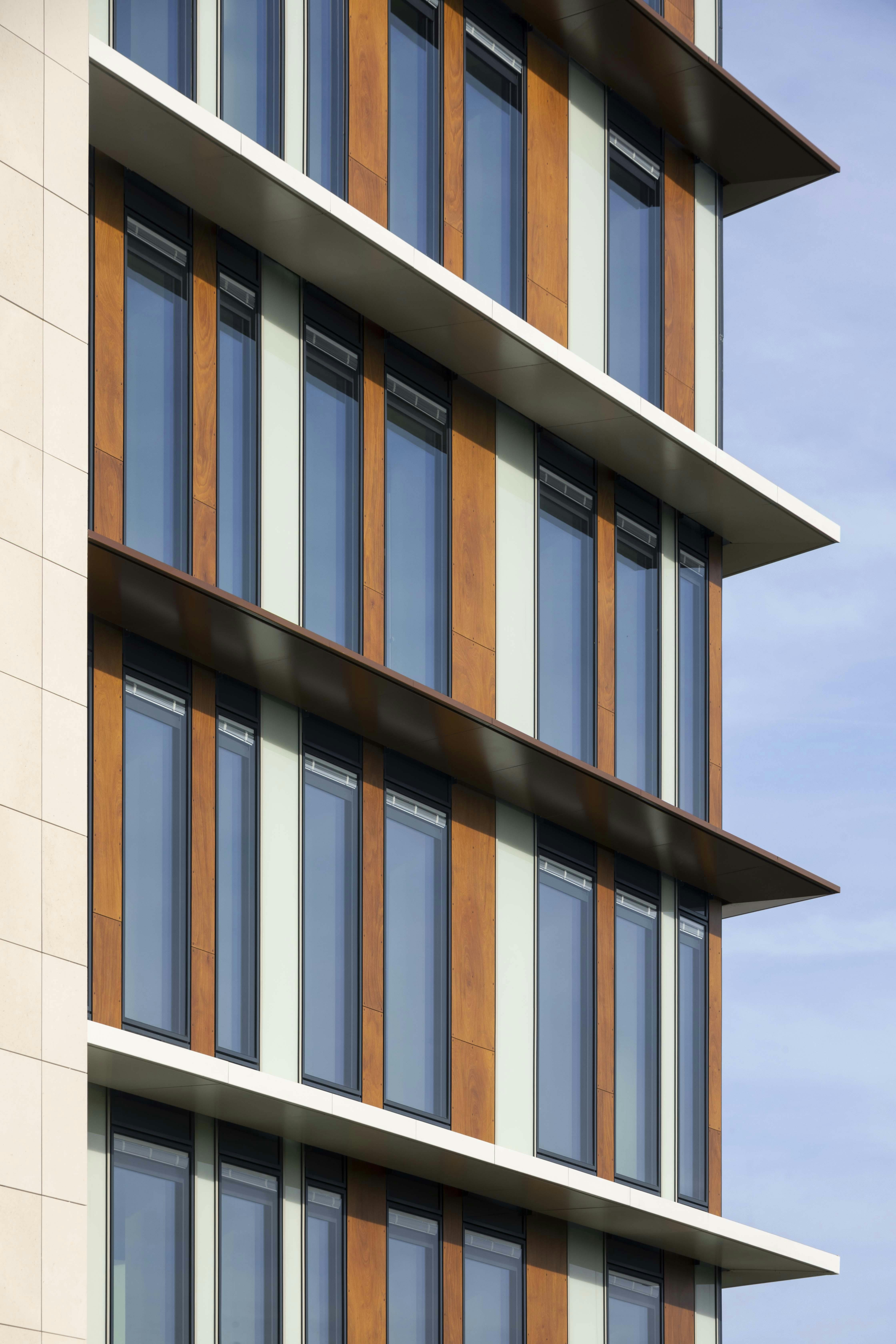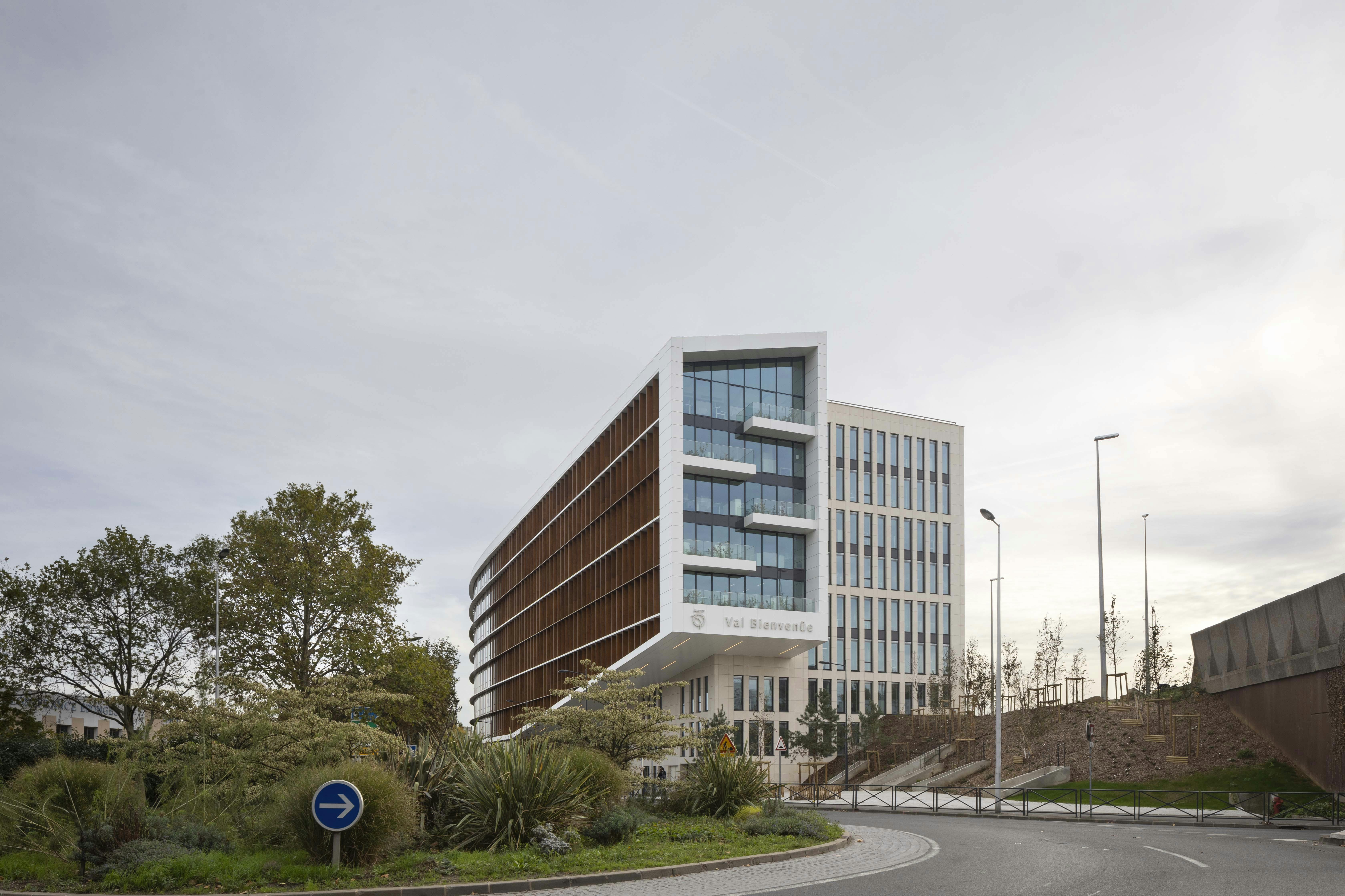 L’implantation du projet s’attache à mettre en valeur les atouts du site : sa visibilité, son environnement et sa desserte. Sa volumétrie en R+8 s’implante pour partie le long de l’avenue Louison Bobet et épouse la courbe du terrain. Des ailes perpendiculaires s’en détachent pour rejoindre la limite de l’autoroute. Le bâtiment présente une façade urbaine à l’échelle de la ville et une composition rythmée à l’échelle de sa lecture dynamique depuis l’autoroute. Afin de lui conférer une « adresse » clairement lisible, le volume principal se soulève dans sa première séquence au-dessus du cheminement d’accès et invite naturellement l’utilisateur vers son accès principal.