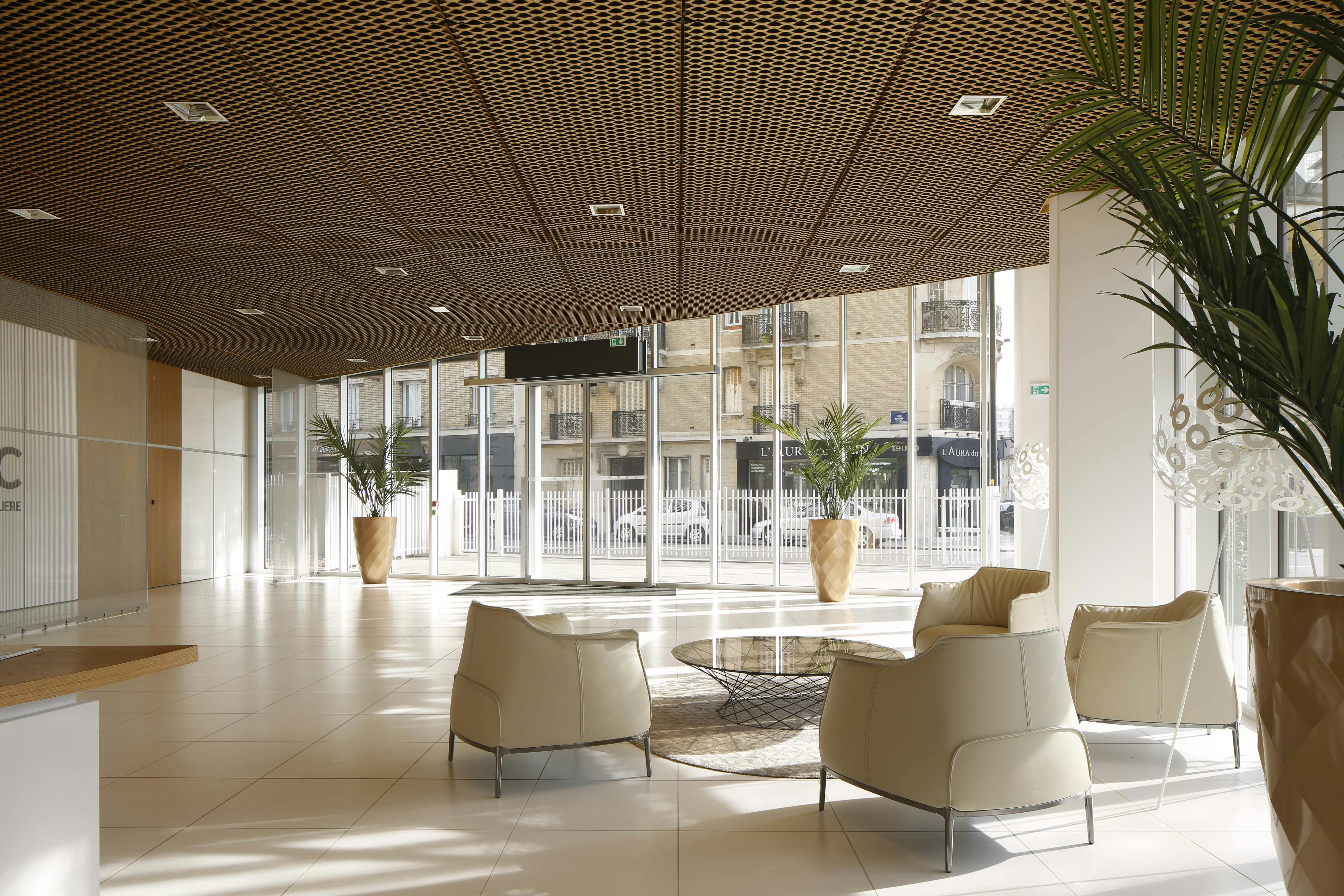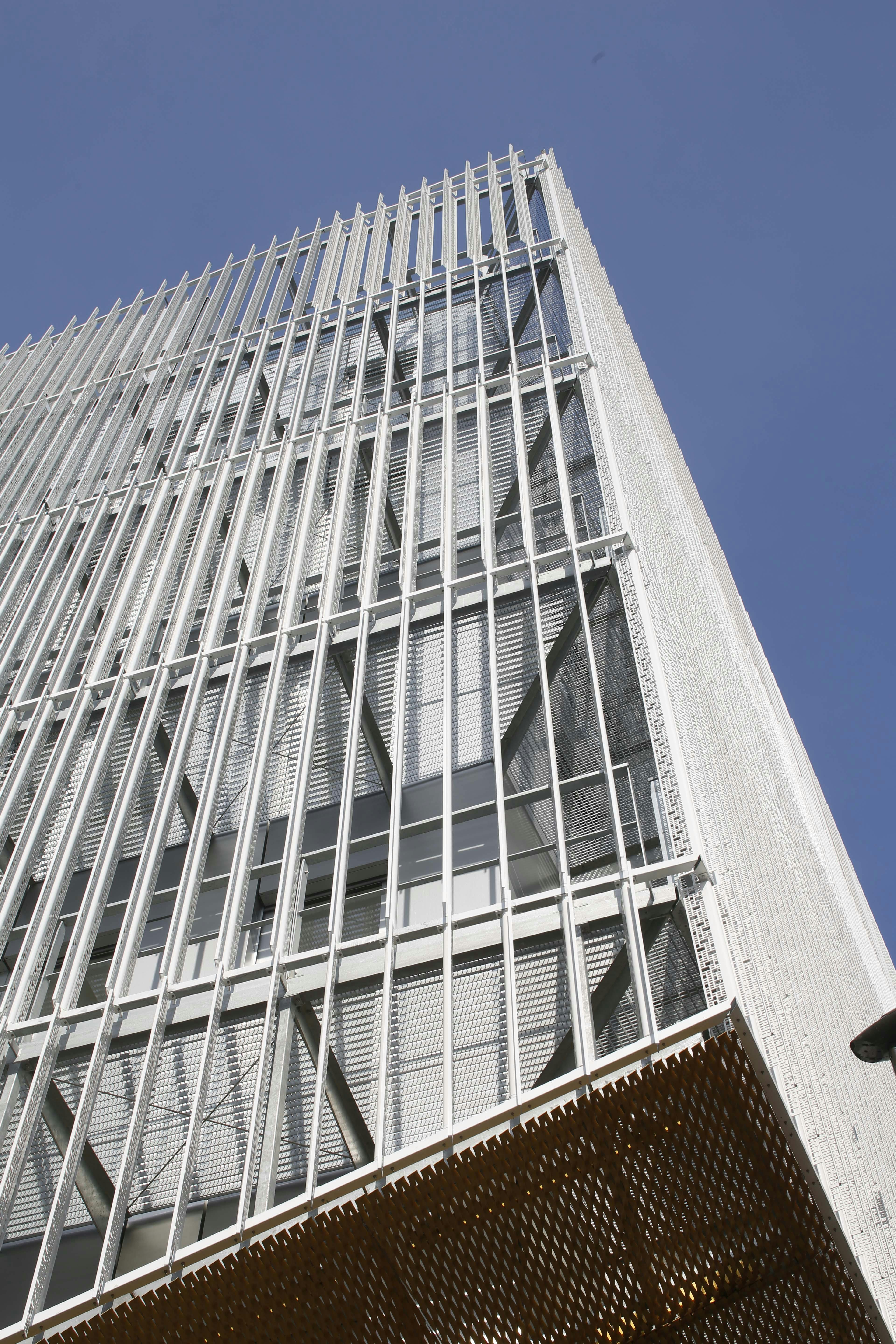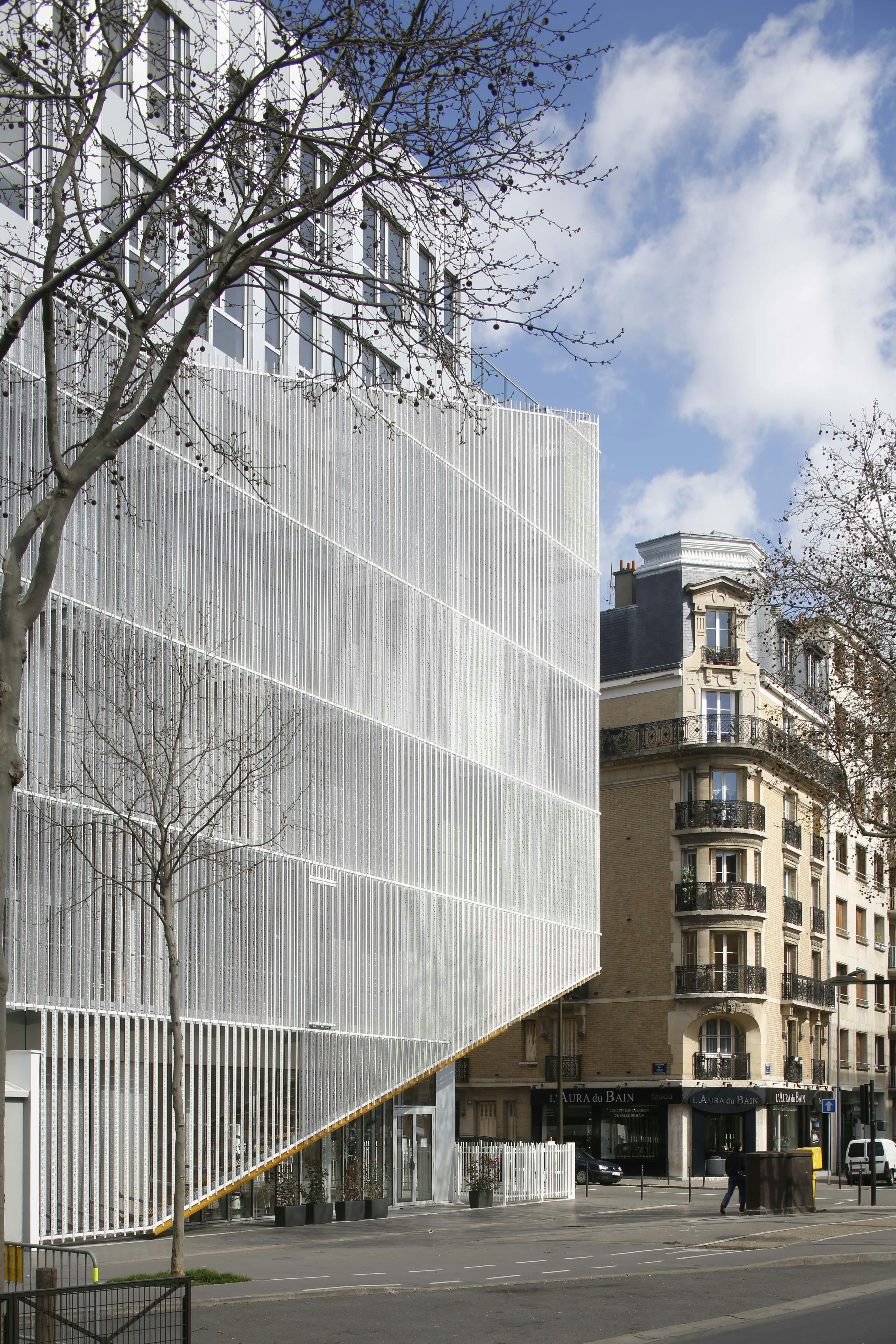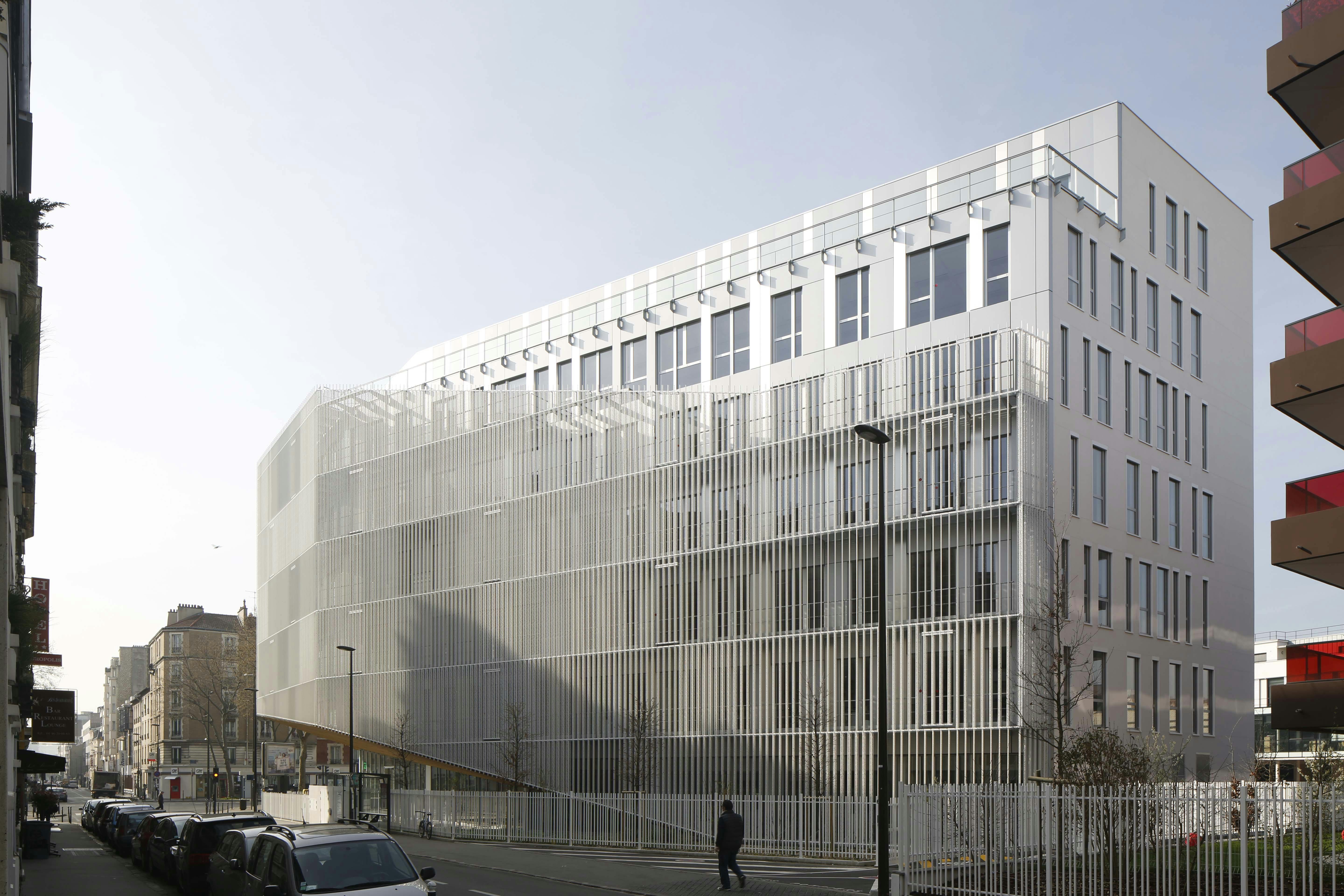 L’immeuble de bureaux, siège d’OGIC, est enveloppé d’une légère gaze métallique qui lui fait perdre ses limites. Le traitement nuancé de blanc brillant et satiné de cette peau moirée lui confère la vibration recherchée. Les deux plans de lecture de sa volumétrie campent l’angle formé par l’avenue Édouard Vaillant Couturier et la rue Thiers en offrant une continuité d’échelle avec la morphologie du bâti existant ainsi que les lignes dynamiques du projet de logements qui s’inscrivent à sa suite.