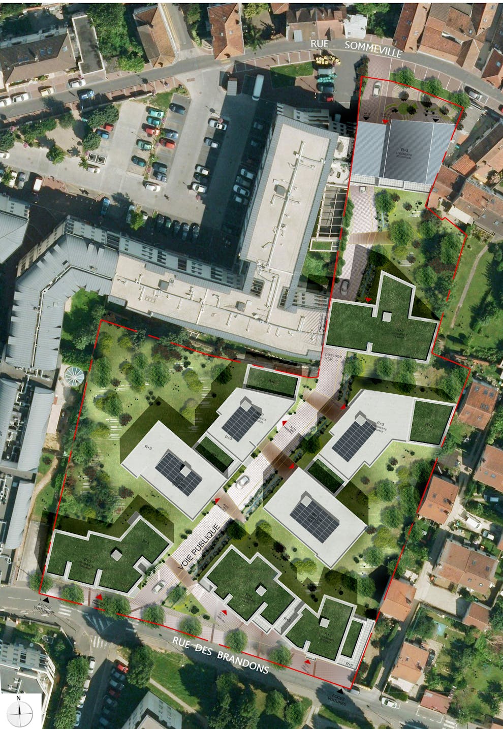 L’ambition pour la ville est de désenclaver ce site en créant un lien nord-sud fort qui met en relation les rues qui bordent le projet, voire au-delà. Cet axe structurant s’accompagne d’une noue végétalisée en pleine terre qui contribue au paysage de la voie et à sa dimension naturelle. L’ensemble se termine par une place trapézoïdale au sud sur la rue des Brandons.