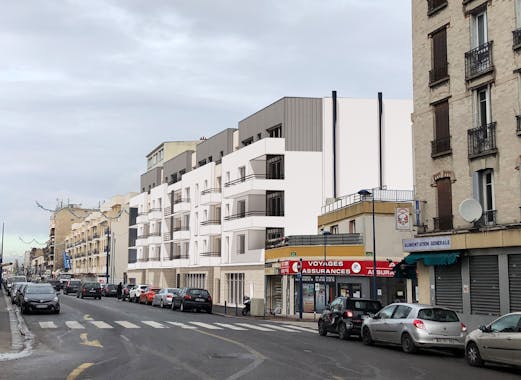D’ordonnancement classique, la façade sur rue est composée d’un soubassement en parement de pierre « type meulière » et d’enduit beige dans les retraits, d’un étage courant en enduit, et d’un attique en retrait. Au RDC, les vitrines du commerce sont redécoupées, reprenant les largeurs des parcelles « historiques ». Un jeu de retraits de façades en enduit beige sur la hauteur de l’étage courant, vient séquencer ce linéaire sur rue. L’attique en retrait est composé de boites en métal couleur zinc pré patiné, séparées par des éléments en enduit beige. Les balcons en saillie de moins d’un mètre sur rue, viennent également rythmer la façade. La partie basse des gardes–corps des balcons est réalisée en maçonnerie ou en métal perforé afin de diminuer la Co visibilité entre les logements et la rue.