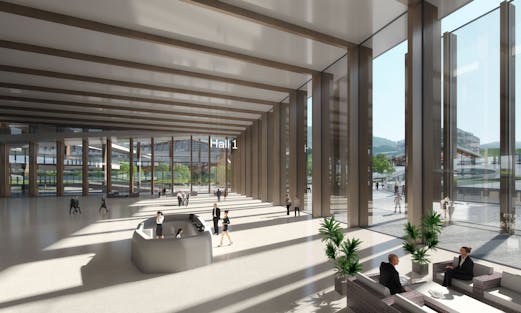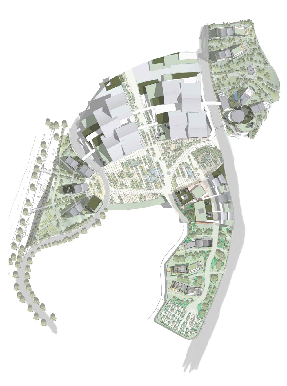 Le projet s’organisent dans un parc autour d’une place ovale, posée dans le paysage. Les bâtiments se glissent dans le terrain par de grands toits végetalisés, d’autres recouverts de tuiles métalliques flottent au dessus et se signalent dans le grand paysage.