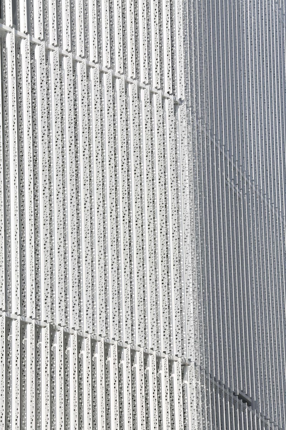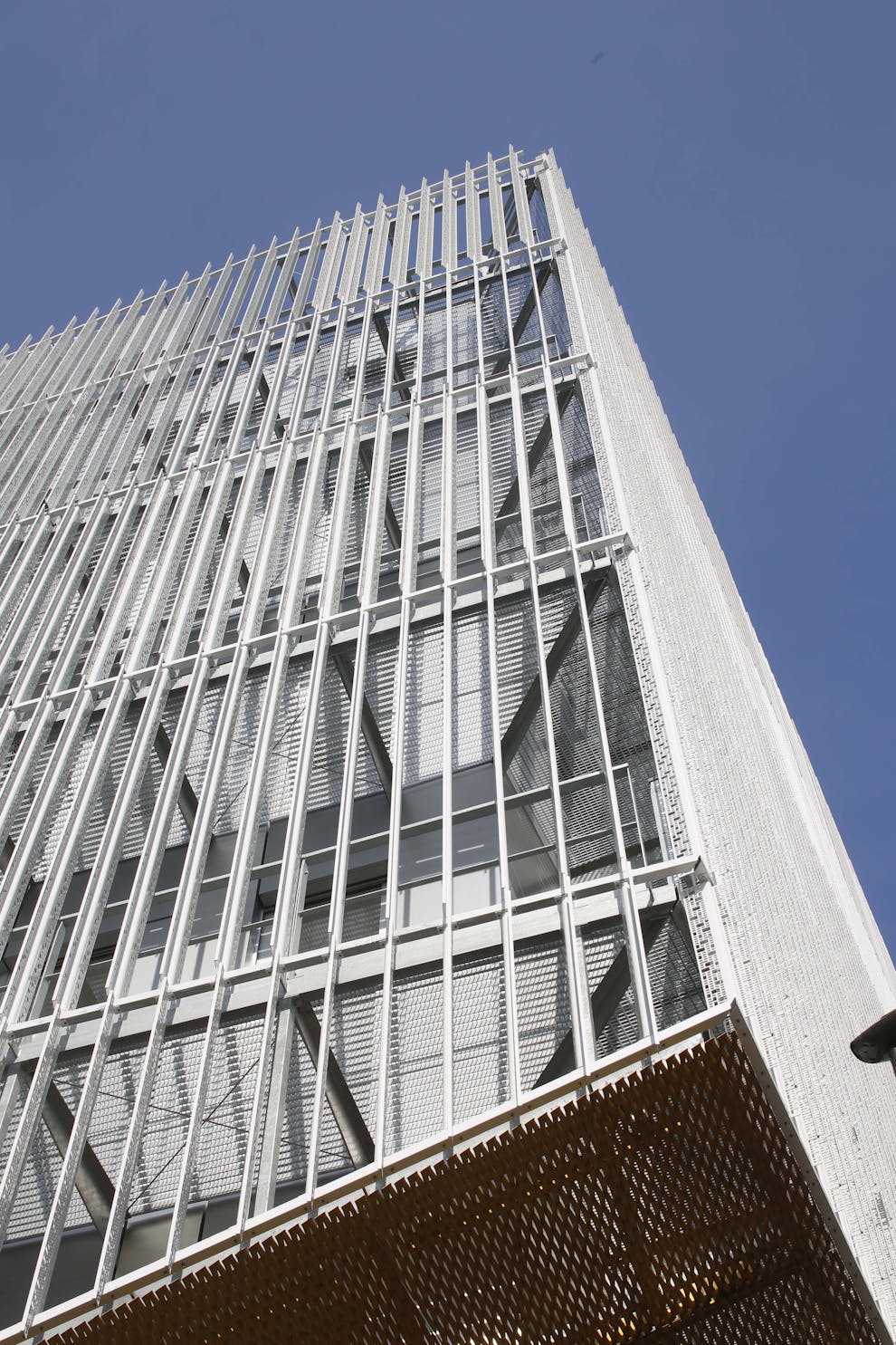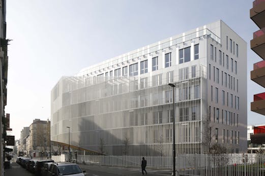 L’immeuble de bureaux, siège d’OGIC, est enveloppé d’une légère gaze métallique qui lui fait perdre ses limites. Le traitement nuancé de blanc brillant et satiné de cette peau moirée lui confère la vibration recherchée. Les deux plans de lecture de sa volumétrie campent l’angle formé par l’avenue Édouard Vaillant Couturier et la rue Thiers en offrant une continuité d’échelle avec la morphologie du bâti existant ainsi que les lignes dynamiques du projet de logements qui s’inscrivent à sa suite.
